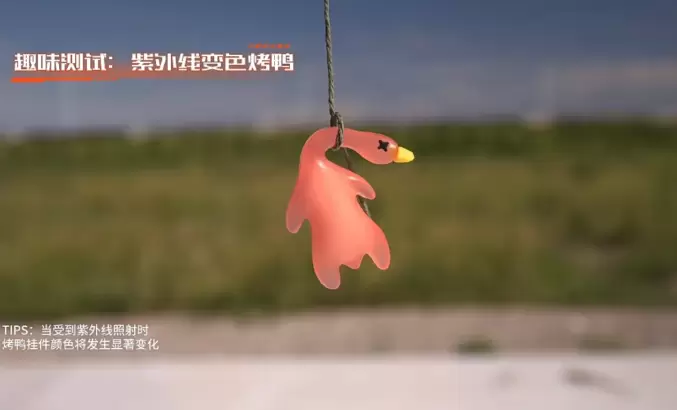 除了专业仪器,我们还加入了一个车主熟悉的 “趣味小测试”—— 紫外线变色烤鸭挂件。这款挂件的特性是:遇紫外线照射会迅速变成紫色,无紫外线则保持原色 。我们将同款挂件分别放在露天环境和贴有三公紫的车内:露天的挂件很快被 “染” 成紫色,而车内的挂件始终保持原貌。