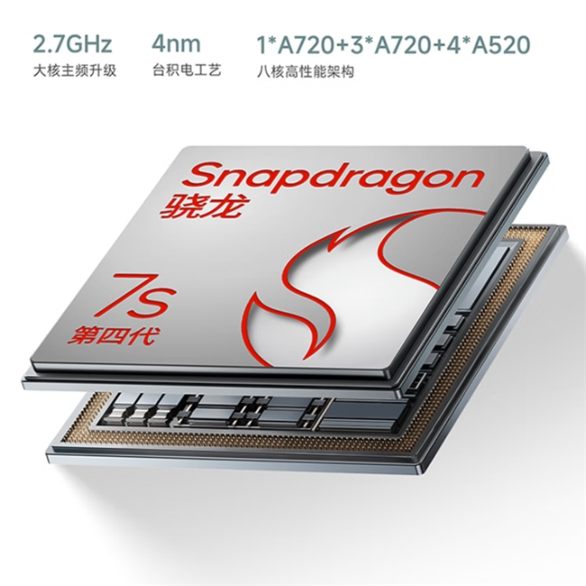 第三名REDMI Note 15 Pro+,首发搭载骁龙7s Gen4,这颗处理器相比上代7s Gen3,制程工艺仍是台积电4nm,CPU中A720大核峰值频率由2.5GHz提升至2.7GHz,本质就是一颗普通的超频版,因此体现到性能分数上并未有质的飞跃,最终Note 15 Pro+性能跑分为756142。