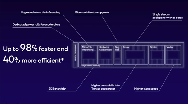 从骁龙8 Gen3那代开始,其AI引擎就有了质的飞跃,NPU从Hexagon DSP升级为Hexagon NPU,并采用了全新的微架构,这使得其AI性能相比骁龙8 Gen2提升了最高98%,同时能效也提升了40%。并且首次真正为移动设备生成式AI进行了深度设计,支持在终端设备上运行参数超过100亿的大模型,实现20 Token/s的处理速度。