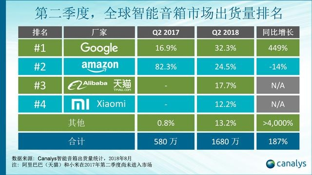 纵观全球智能音箱市场,整个产业增长强势,出货量高占比增长。以市场调研机构给出的2018年第二季度数据为例,整个2018Q2期间,全球智能音箱出货量达到1680万台,这个数据甚至不到很多智能手机厂商一个季度的出货体量,但是对于一个较为新兴的产业而言已经挺不错了。要知道较上一年同一季度而言全球智能音箱出货量的同比增长率高达187%,而智能手机方面呢?同比增长率仅为2%左右。就爆发力而言,智能音箱产业有足够的后劲儿,未来未尝不可期?
