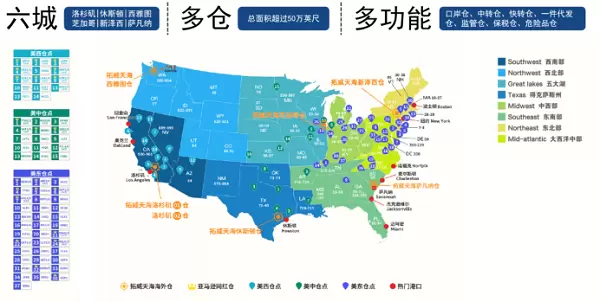 拓威天海的海外基建追溯至10年前,在美国洛杉矶、休斯顿、芝加哥、新泽西、萨凡纳等地布局7大自营本土仓,精准辐射美国90%区域,涵盖口岸仓、中转仓、一件代发仓等多元仓型。自研全球仓系统实现海外仓储精细化管理,实现多仓库存实时同步及动态分仓,降低跨区调货成本;TMS/WMS/OMS三者协同,入仓-签收动态时效稳定在3至5天,提升周转效率,降低仓储成本。