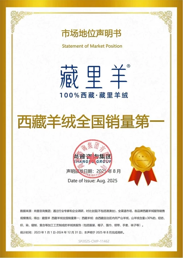 近日,中国高端羊绒品牌藏里羊再添重磅荣誉——全球权威咨询机构尚普咨询集团正式为其颁发“西藏羊绒全国销量第一”认证。这一具有公信力的认证,不仅是对藏里羊卓越市场表现的高度认可,更标志着品牌凭借优质西藏羊绒产品,在行业内占据核心地位,成为中国羊绒产业迈向高端化的标杆力量。