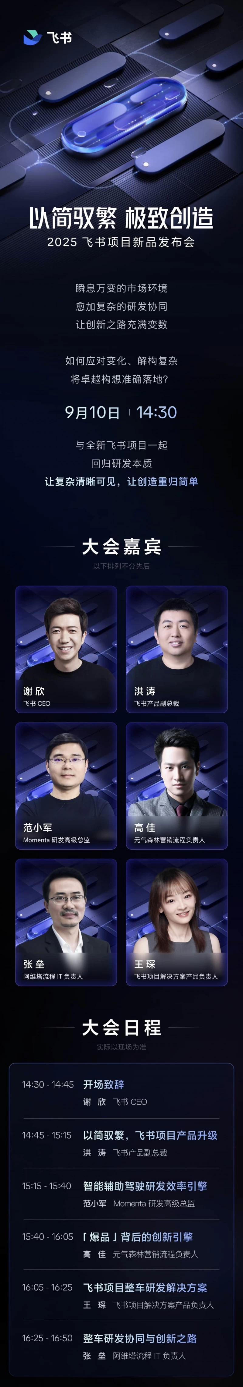 2025 年 9 月 10 日,2025 飞书项目新品发布会将在深圳举办。本次发布会以“以简驭繁,极致创造”为主题,将聚焦研发管理领域的复杂性挑战,分享飞书项目的最新能力升级和最佳客户实践。