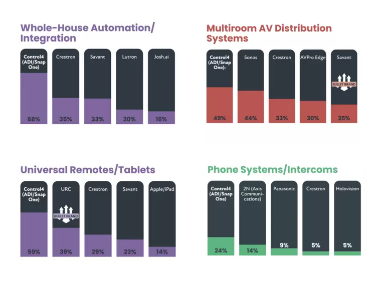 《CE Pro 100》调研对象为美国规模最大、营收最高的100家集成商,其品牌选择在业内极具示范性与趋势指示意义。Control4不仅在“全屋自动化/集成”类别中以显著优势蝉联第一,更在“多房间音视频系统”“万能遥控器”“可视对讲系统”等细分领域摘得“品牌领导者”奖项,体现出其在复杂系统集成与跨品类协同中的综合实力。