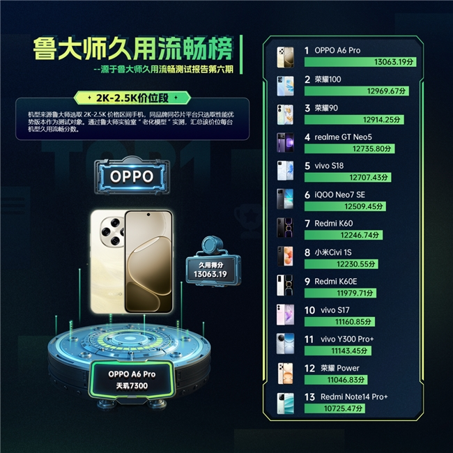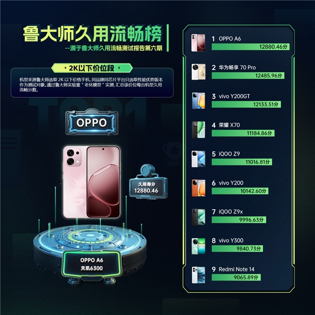 不妨看看刚上市的 OPPO A6 系列。作为大众机型,它的两款机型分别聚焦 2K 以下和 2K-2.5K 价位,符合主流消费需求;可让人意外的是,在行业最严格无水分的鲁大师久用流畅测试中,它俩却在两个价位段中都拿下了久用流畅第一名的成绩,实实在在打破了大众机型 “用久必卡” 的行业固有认知。