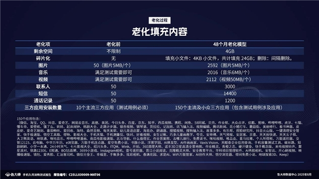 根据鲁大师公布的久用流畅测试报告显示:鲁大师久用流畅测试模型已迭代至2.0版本,手机老化所填充的数据有所升级,包含4KB小文件、图片、音乐、视频、联系人、通话记录及150个主流及小众三方应用,将这些这些数据分48轮写入,最后直至手机存储仅剩4GB,则成功完成一次老化流程。