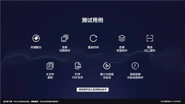鲁大师在老化测试用例也较为符合用户真实使用场景,它们分别是:存储跑分、应用切换平均耗时、重启时间、应用安装平均耗时、微信扫码、大文件复制、打开PDF文件、第三方应用冷启动和自研应用冷启动及耗时,九大场景更是细分成30余个子项。