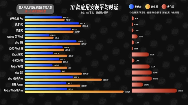 下面来看看考验较高负载流畅度的10款应用连续切换的用例。虽然OPPO A6 Pro 1.79%的老化率没有像友商来到0%,但它老化后的平均时延仅为789.17ms,这个应用切换速度甚至比大多机型老化前还要来得快。