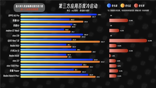再看一个用户高频使用的应用冷启动场景,先举例三方应用“百度”,OPPO A6 Pro、荣耀90、vivo S18老化后的冷启动时延不升反降,因此三者的老化率均为0%。其中,OPPO A6 Pro竟然在老化后,时延反而是下降了接近100ms,大众机型能有这种表现,的确有些惊艳。