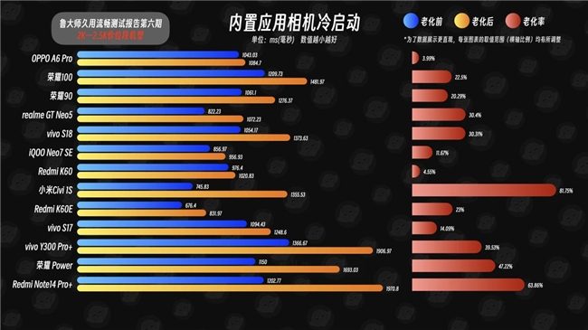 再举一个“相机”的冷启动时延例子,这算一个比较吃性能的内置应用,表现最好的正是OPPO A6 Pro,老化后的时延相较于老化前新机状态仅多出了40ms左右,老化率也才3.99%。和老化率高达81.75%的小米Civi 1S一比,领先幅度有些恐怖。