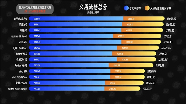 以上只是鲁大师久用流畅测试中一部分数据,其它详细数据,各位可以前往鲁大师实验室官网查阅,这里就不一一列举了。最终通过汇总老化率得分和久用后性能剩余分数后,OPPO A6 Pro,以13063.19分的成绩成功坐稳2K-2.5K价位段久用流畅冠军。