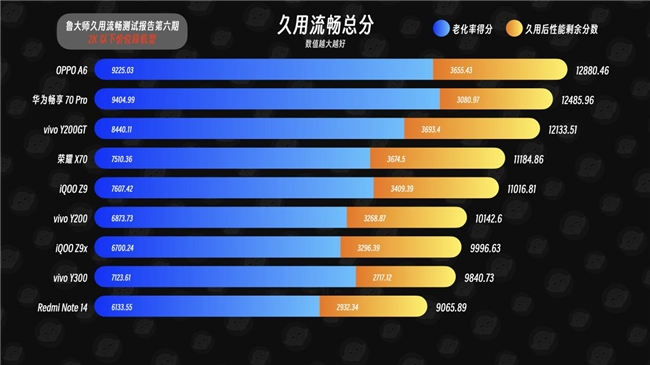 OPPO A6则属于2K以下价位段阵营,这里就直接揭晓成绩,虽然其久用后性能剩余分数仅落后于vivo Y200GT和荣耀X70,但它的老化率得分则是把其他机型远远甩在身后。综合前两项得分,最终取得该价位段久用流畅冠军依然是OPPO A6,久用流畅总分12880.46,甚至超越第二名近400分,能取得这样的成绩,足以见得OPPO在处理器硬件与ColorOS系统软硬协调的强大实力。