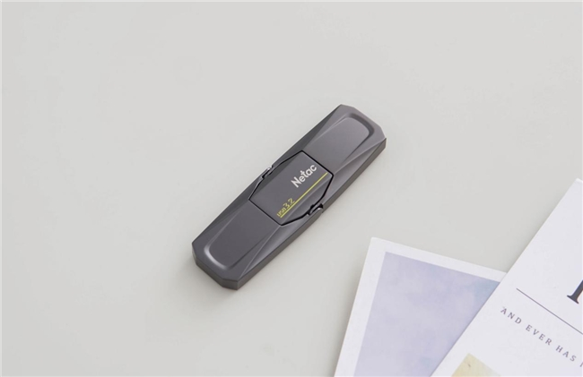朗科US5采用的是锌合金外壳与珍珠枪配色,赋予不俗质感和坚不可摧的耐用性,中央醒目的是朗科Logo,标识有USB 3.2的高速传输,流线型设计汲取跑车灵感,接口巧妙藏匿于“引擎盖”之下,一掀即露,一合即隐,尽显匠心独运与便捷之道,还能起到防丢效果。