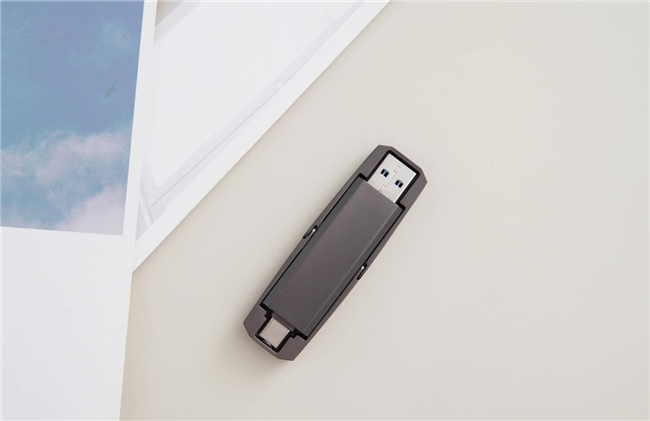 朗科US5的左侧为高速USB Type-C接口,右侧则为USB Type-A接口,两者均支持10Gbps数据传输速率,两侧的金属翻盖设计精巧,厚度适中,不仅完全覆盖U盘,还为其提供了坚实的保护。
