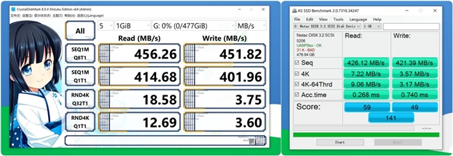 在公司的台式机上,我利用CrystalDiskMark测速软件进行了详尽的测试。尽管公司主机配备的是USB 3.1接口,限制了朗科US5的巅峰性能,但测试结果显示,其读取速度仍高达456.26MB/s,连续写入速度也达到了451.82MB/s,这一速度在USB 3.1接口下已属上乘,充分展现了其出色的性能。