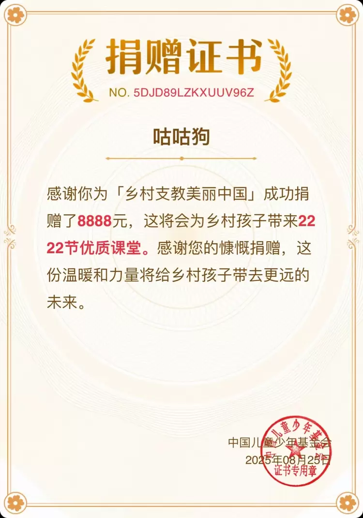 短短7日,便有数千人参与,共捐赠步数8000多万步,提前完成本次的捐赠目标。而这笔由大家共同兑换的公益金,将捐赠至腾讯公益【乡村支教美丽中国】项目,为乡村孩子们送去2222节优质课程。咕咕狗也由此荣获2025年久久公益节的第十一届“久久勋章”。