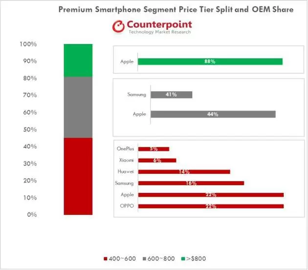 在600至800美元价格段中,苹果和三星分别占据44%和41%的市场份额;在800美元以上的价格段中,苹果独占88%市场份额。