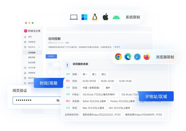 ● 精确控制访问权限,保障应用安全连接:贝锐花生壳还具备多维度监控状态、多渠道告警通知以及精细的“访问控制”功能,可以精确设置访问权限,例如指定特定时间、IP地址、地区等条件下才能远程访问映射的设备,可满足煤矿、能源企业对数据安全合规的需求。
