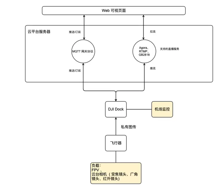 以DJI大疆无人机系统为例,由于DJI大疆无人机支持摄像头画面通过遥控器或机场传输链路推送到云端或第三方平台,因此企业或是系统集成商在部署时,可以自建支持Agora/RTMP/GB28181/WebRTC/WHIP等协议的流媒体服务器,并搭建MQTT网关实现无人机的消息通信,配置信息设置和读取。
