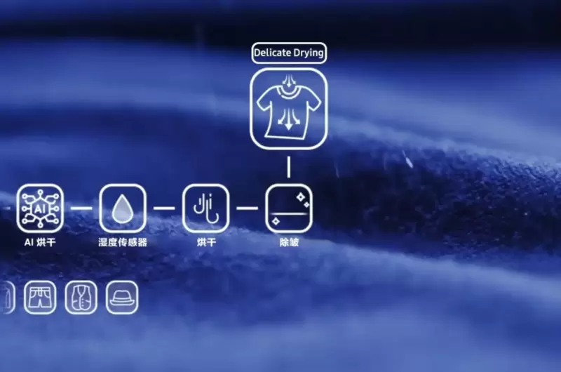 三星AI神 黑钻衣物护理机以创新科技重新定义了高端衣物的节能护理方式,为注重品质与环保的家庭提供了理想解决方案。在“AI烘干”技术的加持下,通过AI智能湿度传感器主动调整烘干时长,达到了护衣护色、低温柔烘、节能省电的效果。