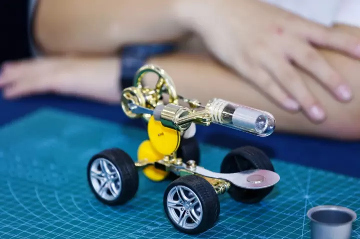 九月的浙江,流火未歇,科学的热情早已点燃了各个角落。在南湖畔的浙江清华长三角研究院内,来自清华附中的学生们正蹲在地上,眼睛紧盯着一辆辆微微颤动的小车——它没有电池,没有马达,只在底部燃烧着一盏酒精灯。突然,随着气缸内空气的规律胀缩,小车“嗡”的一声向前滑行,轮子转动,仿佛被看不见的力量推动着。“动了动了!”一个男生激动地喊出来,这一刻,课本上的理论知识变成了实实在在的成果。原来,科学并非冰冷的公式,而是热气升腾时车轮开始转动的那个瞬间。