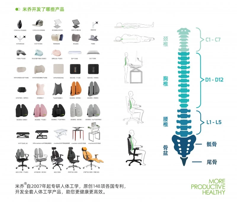 依托18年来积累的400+知识产权及148项多国授权专利,米乔人体工学已构建覆盖撑腰、护颈、办公、居家、睡眠等多场景的产品体系。其人体工学解决方案广泛应用于各类工作与学习场景,为用户提供健康、舒适与高效的产品体验。