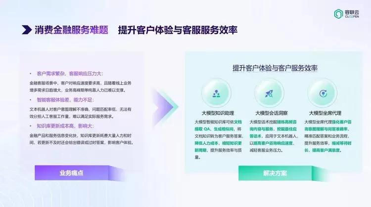 容联云凭借在金融行业的丰富经验,已成功帮助多家银行、消金等金融公司完成从小模型到大模型系统的平滑迁移。