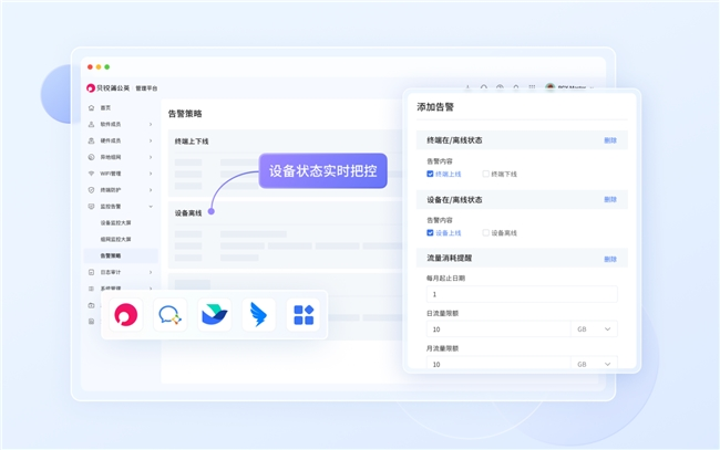 面对出入口物联网设备数量众多、故障排查难的问题,贝锐蒲公英能通过云平台实现设备状态与链路运行的实时监测。一旦出现异常,可根据设定的告警策略,第一时间记录并推送告警信息至蒲公英管理APP,或通过企业微信、钉钉、飞书等第三方IM工具实时通知运维人员,帮助快速定位问题设备,缩短故障排查周期,提高运维效率。
