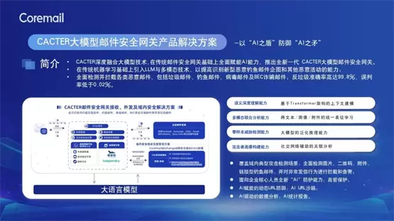 据Coremail《2024中国企业邮箱安全性报告》显示,2024年,全国企业邮箱用户共收到各类钓鱼邮件约755.0亿封,相比2023年增加了30.8%。生成式AI已成为各类恶意邮件的重要生产者之一。攻击者利用AI大模型实现自动化升级、伪装升级、策略升级,每分钟都有数万封 AI 生成的恶意邮件涌入网络。为应对这一威胁,CACTER大模型邮件安全网关在传统机器学习基础上引入LLM与多模态技术,提高识别新型恶意钓鱼邮件企图和其他恶意活动的能力。