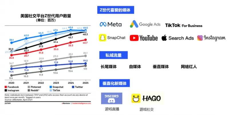 Z世代的注意力呈现高度碎片化特征,广泛分散于各类新兴社交及内容平台。他们不仅对创新型社交网络接受度高,且更倾向于在这些平台上进行深度互动和消费。数据显示,美国年轻用户对Snapchat、TikTok等新兴社交平台的使用频率远高于传统平台,同时对游戏直播和游戏社交媒体的喜爱度也非常高,游戏内容已成为其线上社交与娱乐生活的重要组成部分。