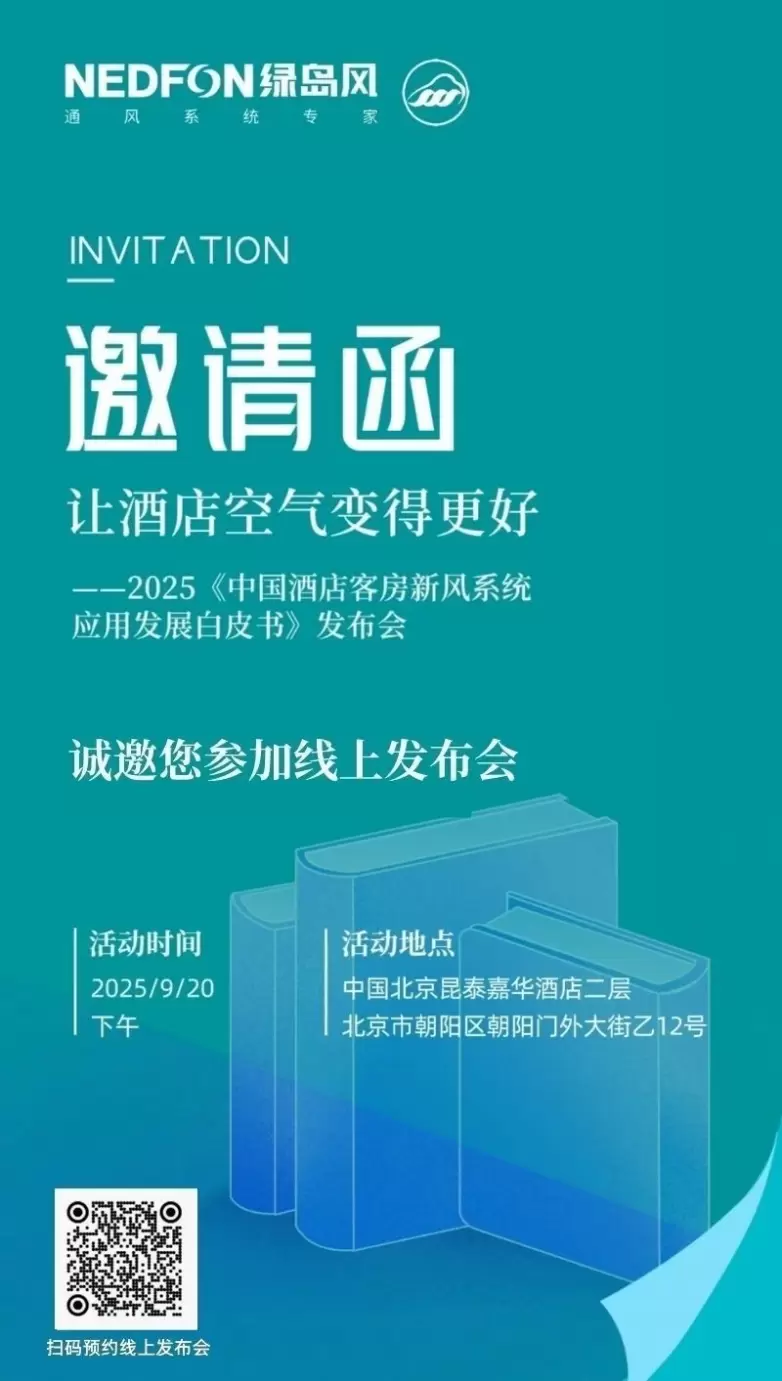 我们诚挚邀请酒店行业投资者、管理者、工程师、设计师,以及所有关注健康居住环境的朋友们,9月20日,锁定绿岛风视频号直播间,云端共聚本次发布会,一同见证行业里程碑时刻,在线探讨酒店空气品质的未来发展之路。携手同行,共建共生。无论您身在何处,都能与我们隔屏相见。扫码预约,不见不散,让我们携手努力,共同守护酒店的每一次健康呼吸!