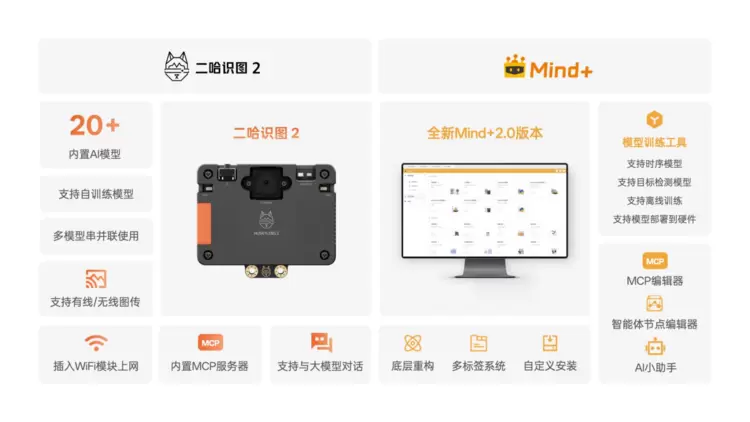 新版Mind+以“轻量化、智能化、开放化”为核心理念,完成了深度底层架构重构。软件全面适配二哈识图2,深度融合AI教学场景,通过三大创新突破降低人工智能创作门槛: