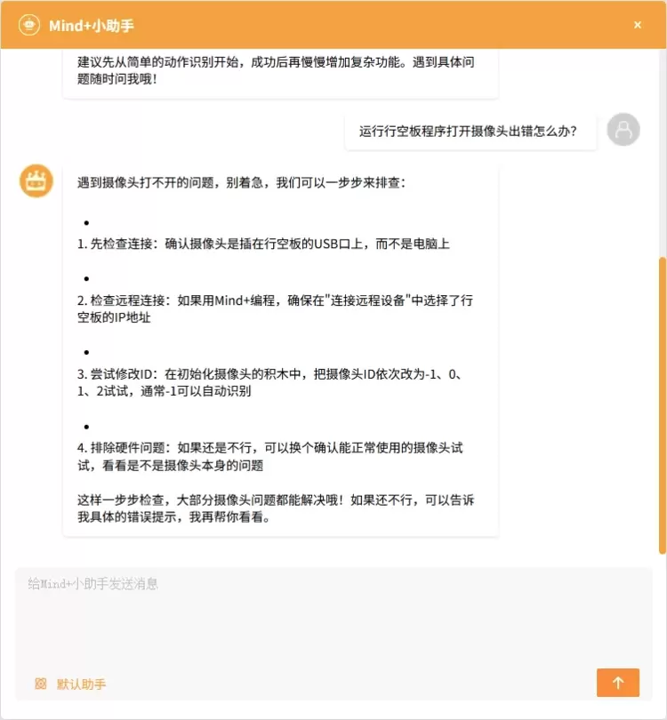 AI智能体节点编辑器:学生可以⾃定义智能体的提示词,选择不同的⼤语⾔模型,结合Mind+的图形化编程,轻松控制各类硬件设备。这个编辑器将AI智能体和硬件控制结合,让项⽬真正“活”起来,具备⾃主理解任务、判断和执⾏操作的能⼒。