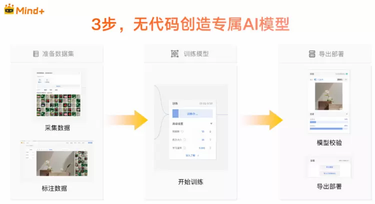 复杂的环境配置、繁琐的训练流程常常让AI学习者望⽽却步。为此,Mind+推出了全新的模型训练⼯具,将模型训练的流程提炼为简单三步: