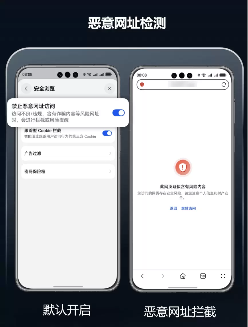 恶意网址如同“暗礁”时刻威胁着用户信息与财产安全,面对日益复杂的网络安全威胁,华为浏览器接入国家涉诈黑样本库,能够提供恶意网址拦截功能,可为用户实时检测、精准识别网站安全性。尤其对智能手机操作不太熟悉的老年人群体,这一功能更为关键。