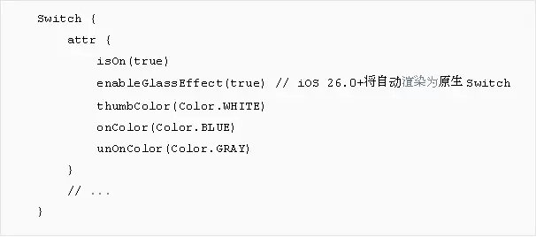 iOS特有组件:对 `Slider` 和 `Switch` 这类在iOS 26上拥有全新动态效果的控件,我们在渲染层新增了iOS平台专属的组件进行封装,这确保了这些控件在具备液态玻璃效果的同时,能够获得与原生完全一致的交互体验。在上层DSL使用上,我们封装了平台差异,开发者无需修改原有组件的使用代码,只需添加 `enableGlassEffect(true)` 属性,即可轻松启用。