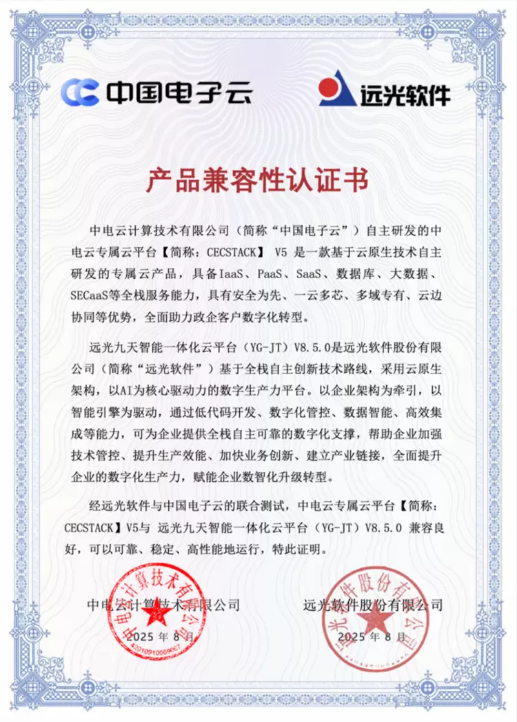 近日,远光软件自主研发的九天智能一体化云平台(YG-JT)与中国电子云·中电云专属云平台V5版本完成双向兼容性互认证。