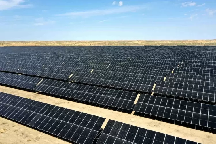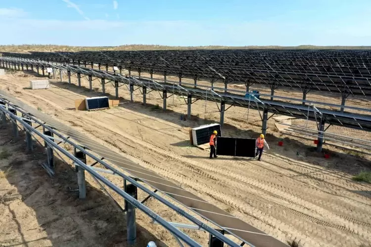 “荒漠变蓝海、牧草映光伏”,该项目创新采用“光伏+生态治理”模式,在光伏板下种植耐旱牧草固沙,实现牧光互补,既护生态又富牧民,为昌吉北部荒漠区披上绿色“光伏铠甲”。