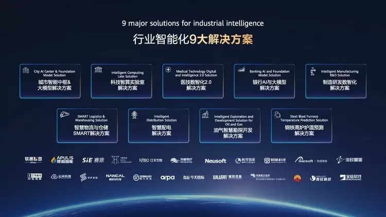 当日,华为还发布了联合伙伴开发的9大行业智能化解决方案,包括:城市智能中枢&大模型、科技智算实验室、医技数字化2.0、银行AI与大模型、制造研发数智化、智慧物流与仓储SMART、智慧配电、油气智慧勘探开发、钢铁高炉炉温预测等。