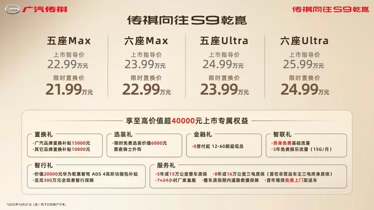 传祺向往S9乾崑上市指导价22.99万元起,可选五六座,满足不同用户购车需求。同时还为用户准备了六大诚意十足的上市礼包,综合价值超40000元。