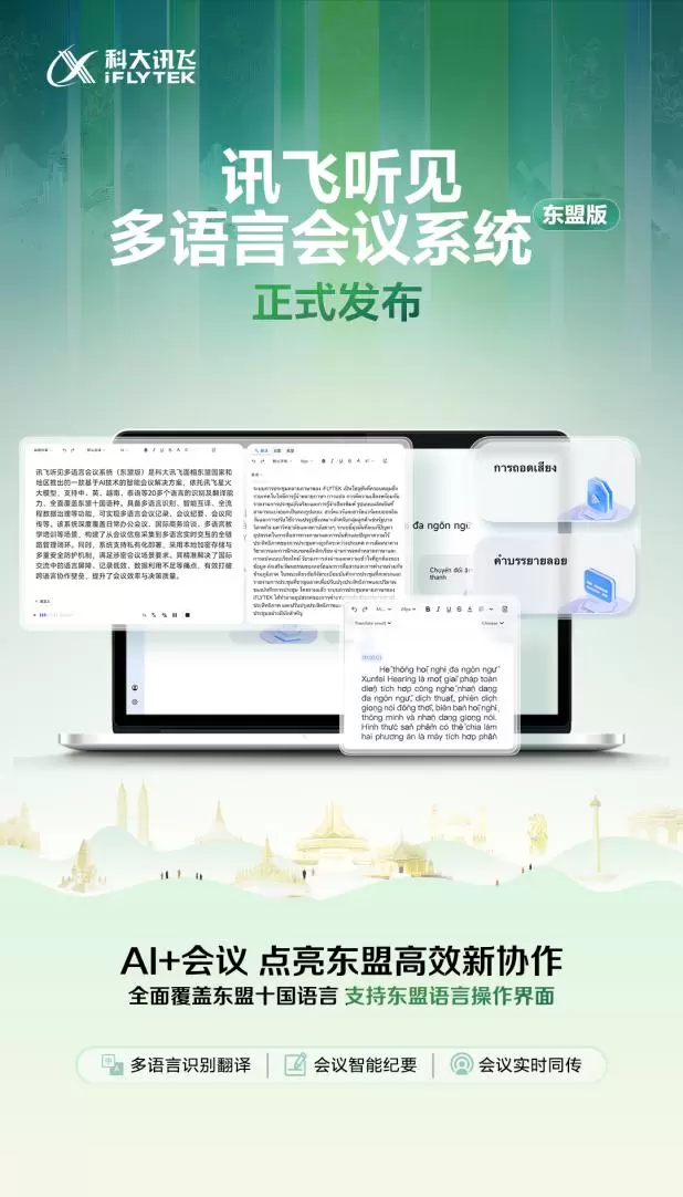 在本次中国-东盟博览会上,讯飞听见多语言会议系统(东盟版)的正式发布,标志着智能会议技术迈入了区域化深度定制的新阶段。该版本针对东南亚地区多元化的语言环境进行了全面升级与优化,深度融合东盟各国的语言特点与文化背景,提供对东盟十国官方语言的精准识别与实时互译。
