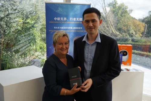 现场,科大讯飞市场部总监任萍萍代表科大讯飞向欧盟旅游年主管机构——欧盟增长总司(DG GROW)旅游、新兴和创意产业处处长艾瑞克赠送了讯飞翻译机2.0。