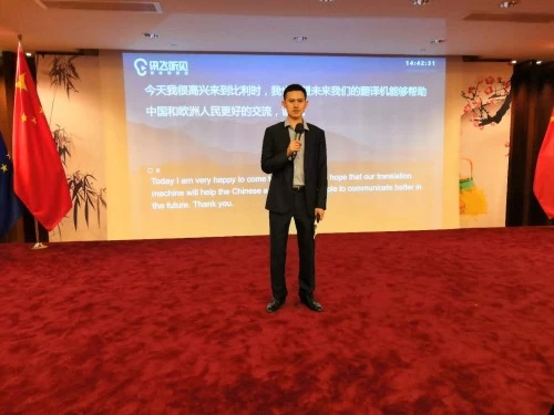 开幕式上,科大讯飞翻译业务总经理翟吉博用英文发言,他表示,“两千年前欧洲和中国分别是丝绸之路的终点和起点,现在二者又成为一带一路倡议、丝绸之路经济带的终点和起点,如今两地在时间和空间上的互通已不再是问题,但语言不通还是难倒了很多想要深入探寻彼此的人们。”期间,翟吉博说的每一句英文都被实时转写显示在大屏幕上。