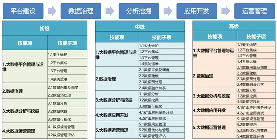本《人才技能标准》按照内容的复杂度,分成初、中、高三个级别,初级定位是辅助支撑者,在有明确的操作步骤的前提下完成操作任务;中级定位是独立执行者,能独立完成较复杂的工作任务,并参与规划工作;高级定位是规划主导者,主导开展工作,并指导初/中级从制度到实施、从规划到优化等实施工作,具体如下: