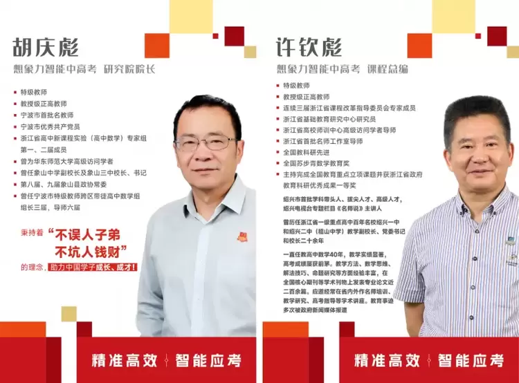 胡庆彪校长(想象力智能中高考研究院院长):拥有40 余年一线教学经验,是宁波市首批名教师、宁波市优秀共产党员,曾担任浙江省高中新课程实验(高中数学)专家组第一、二届成员,历任象山中学副校长及象山三中校长、书记,同时担任第八届、九届象山县政协常委。从课堂教学到学校管理,从课程改革到教育决策,胡校长全方位深耕教育领域,对中高考命题规律、学生学习痛点有着精准且深刻的洞察。