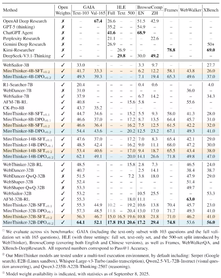 MiroFlow框架之外,MiroMind团队推出的自研旗舰基础智能体模型(AgentFoundationModel)——MiroThinker,不仅具备强大的推理、决策和多模态理解能力,还能在多Agent协作中发挥核心作用,在各类榜单中已成为开源模型的引领者,并不断缩小与闭源商业模型的差距。MiroThinker很快将以完全开源的形式向全球开发者和研究者开放,提供可复现的模型和实验环境。