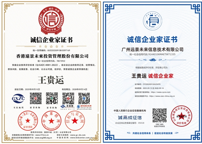 近日,香港远景未来投资管理股份有限公司及其内地关联企业广东远景未来信息技术有限公司分别荣获国家标准化管理委员会AAA企业信用评价与中国人民银行企业征信系统AAA企业信用评级。