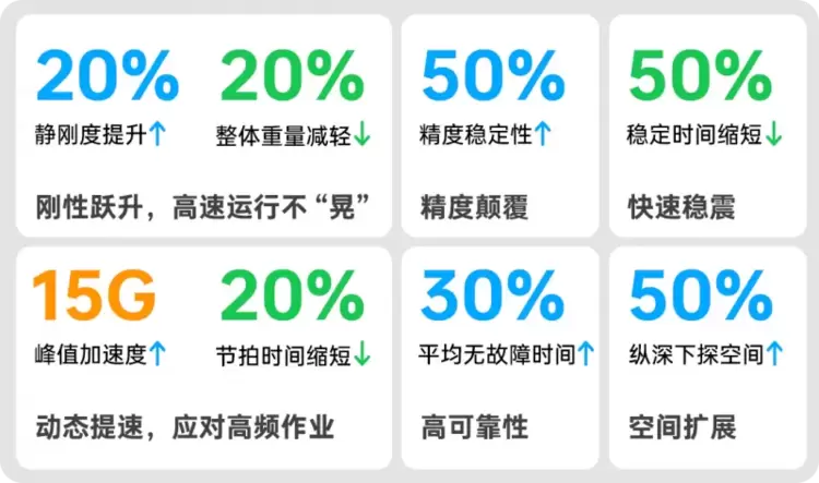 1.极速响应:静刚度提升20%,节拍时间缩短20%