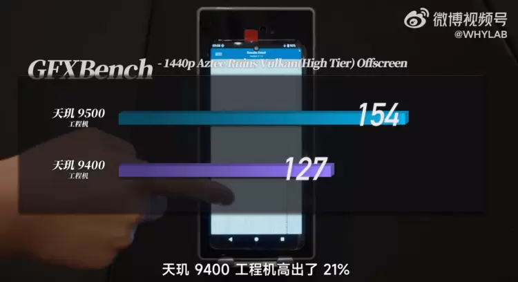 数据说话才最有说服力。WHYLAB实测,GFXBench 1440P Aztec Ruins离屏场景跑到154帧,相比天玑9400提升21%;