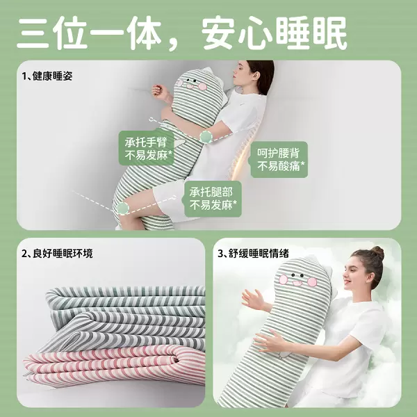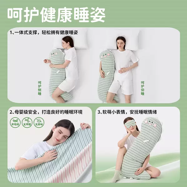 一体式支撑设计:科学引导健康睡姿。乐瓜睡觉抱枕(Sleeping Body Pillow)采用 “手抱腿夹”一体式支撑设计,可同步对人体手臂与腿部进行稳定承托,按照人体工学原理分散肩部、腰部、胯部的压力,有效缓解身体负荷。该设计能帮助维持脊柱自然生理曲线,减少夜间无意识翻身次数,确保睡眠过程中睡姿稳定,避免因姿势不当导致的肌肉劳损与关节压力,从根源上解决晨起腰酸背痛问题。
